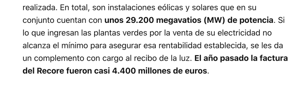 Mientras tanto, las instalaciones acogidas al régimen retributivo específico de renovables, cogeneración y residuos (Recore), que antes recibían ayudas en forma de primas por su producción, ahora cuentan con una rentabilidad garantizada por ley, ligada a la inversión realizada. Si lo que ingresan los megaproyectos industriales de “renovables” por la venta de su electricidad no alcanza el mínimo para asegurar esa rentabilidad establecida, se les da un complemento con cargo al recibo de la luz. El año pasado la factura del Recore fue de casi 4.400 millones de euros (a pagar por los consumidores).