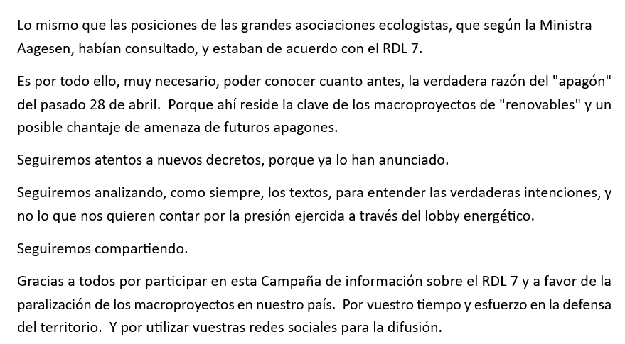 Este Real Decreto Ley se hace, una vez más y como venimos denunciando ya años contra otros Decretos, a medida de la patronal de megaproyectos eólicos y fotovoltaicos en nuestro país: cerca de 5 GW corrían peligro de perder avales y toda la tramitación, ya que la autorización administrativa de explotación vencía el pasado 26 de junio. Es decir, un día después de que entrara en vigor este Real Decreto.