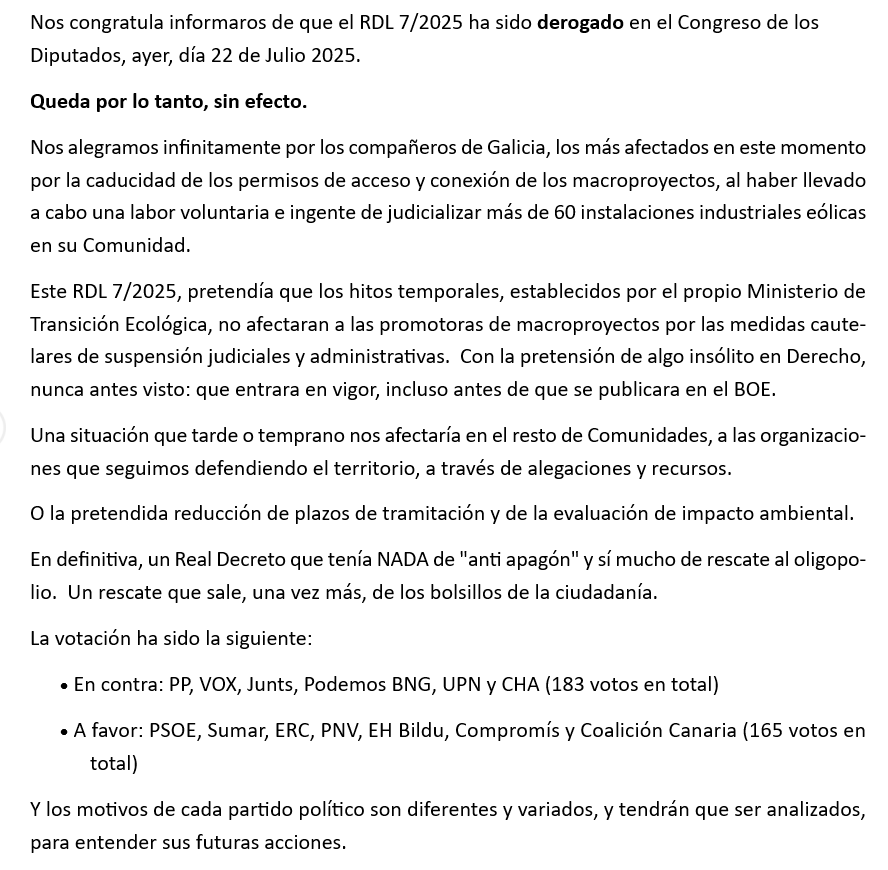 Diferentes entidades de todas las comunidades autónomas estamos adhiriéndonos a esta inicitiva que se opone a la aprobación del 👉🏼 Real Decreto-ley 7/2025, de 24 de junio, por el que se aprueban medidas urgentes para el refuerzo del sistema eléctrico